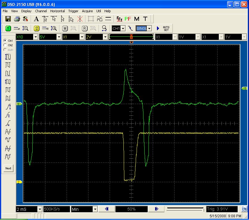Here's some scope pics from my VR sensor output on the YFZ450 motor, same engine as your WR450. The first is at idle ~1700rpm and the second is ~5600rpms, the square wave is the output of my LM1815 circuit. As you know I'm only running fuel with this setup.