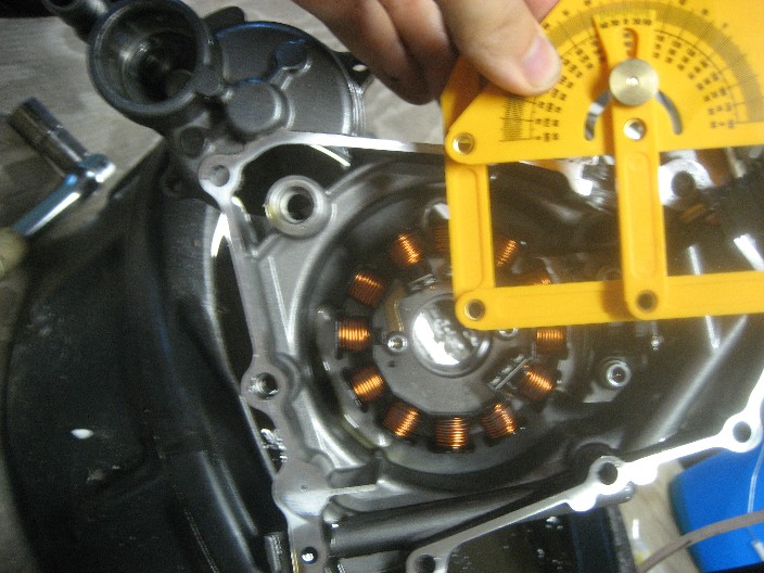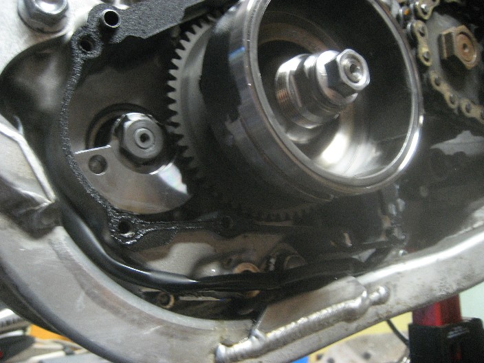 This is the mag cover, the hole on the top is the "window" you look through to line up a mark on the flywheel with a mark on the cover that line up at tdc. On the right is the VR sensor that reads the "tooth" on the flywheel. My halfassed measurements with a protractor put these at 90degrees from each other.